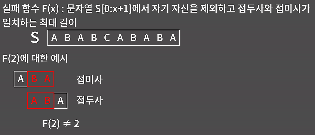 그러면 실패 함수란 무엇인가? 이 함수는 패턴 문자열의 각 위치에서 자기 자신을 제외한 접두사와 접미사가 일치하는 최대 길이를 저장합니다.