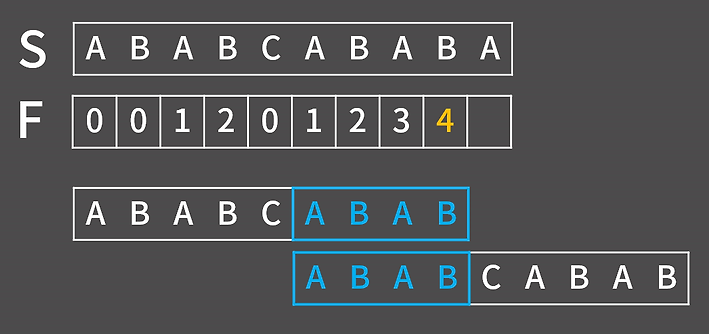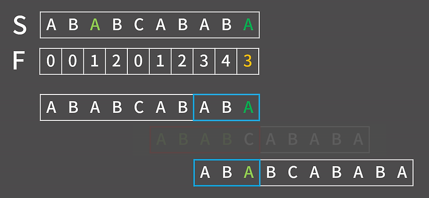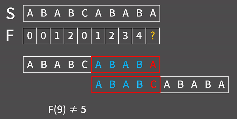 따라서 위와 같이 실패 함수를 채워가면 이러한 형태가 나오는데 위에서 설명한 방법과 다르게 F(9)의 경우 접미사 ABABA와 접두사 ABABC로 A와 C가 다른 상태여서 F(9)!=F(8)+1인 상태이다. 이럴 경우에 F(9)를 한 칸씩 밀면서 구하는 게 아닌 영리하게 구할 방법이 존재한다.