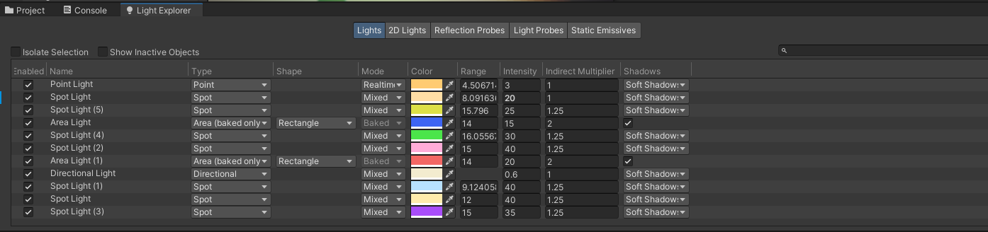 Lighting Explorer는 씬에 있는 모든 조명 요소를 한눈에 볼 수 있는 유용한 도구이다. 프로젝트의 Light, Reflection Probe, Light Probe 등을 효율적으로 관리할 수 있다.