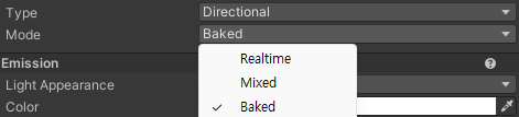 - Realtime과 Baked를 혼합한 형태로 정적인 오브젝트는 Baked 방식을 사용하고, 동적인 오브젝트는 Realtime 방식으로 처리한다. 성능과 품질 사이의 균형을 제공한다.