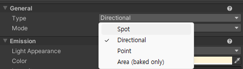 - 사각형 또는 원의 모양으로 설정된 면으로 빛을 비춘다. 런타임 시점에서는 사용할 수 없으며 정적인 환경에서 Lightmap으로 미리 Bake하여 사용해야 한다.