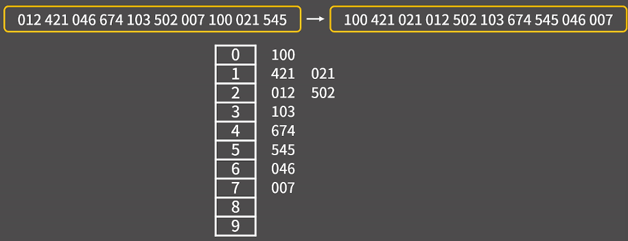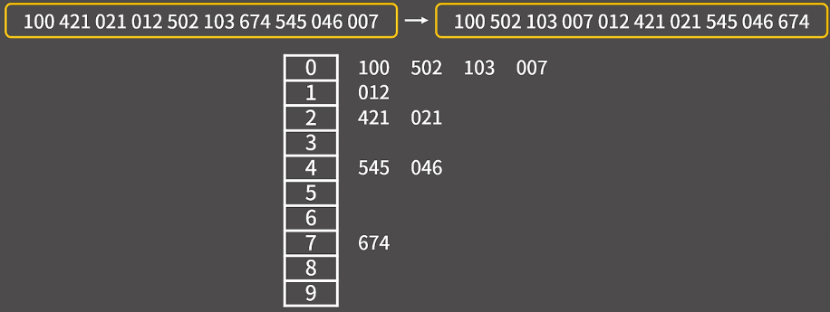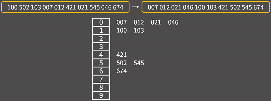 숫자를 비교하는 것이 아니라, 자릿수별로 그룹화하여 정렬하는 방식이 특징이다.