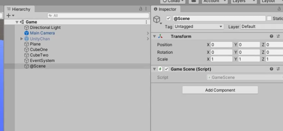 새로운 선봉대 역할을 할 빈 게임오브젝트, 이름은 @Scene으로 해준다