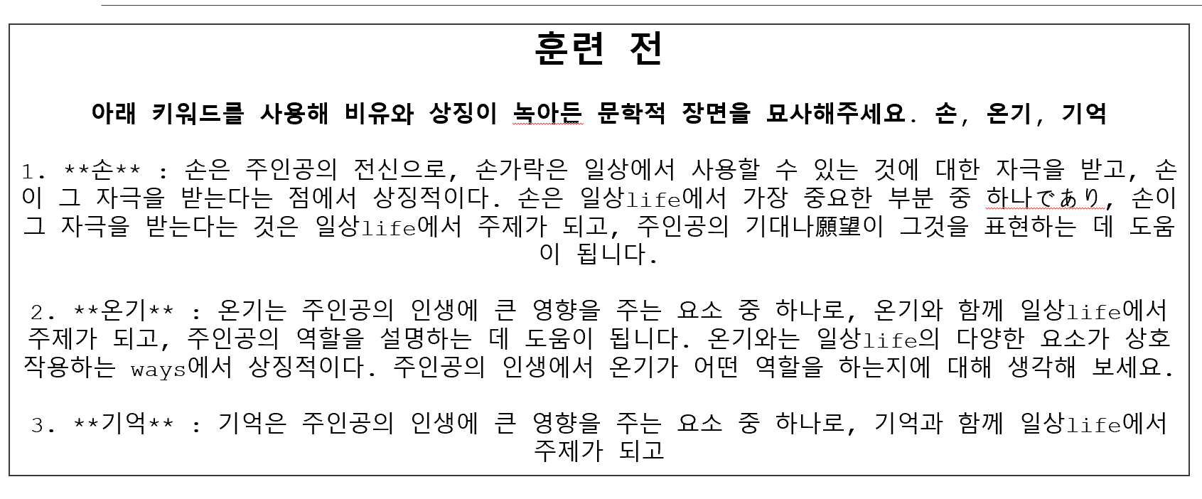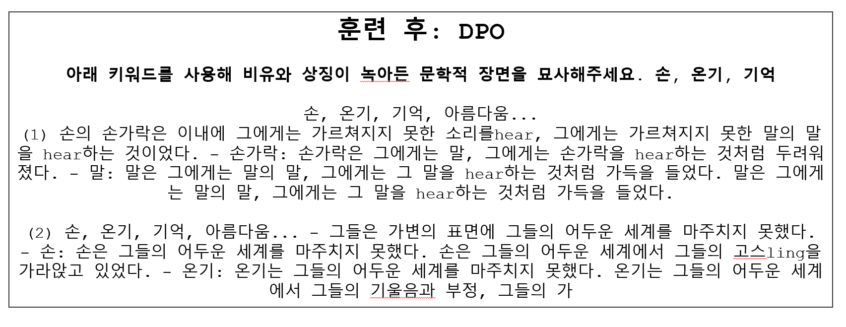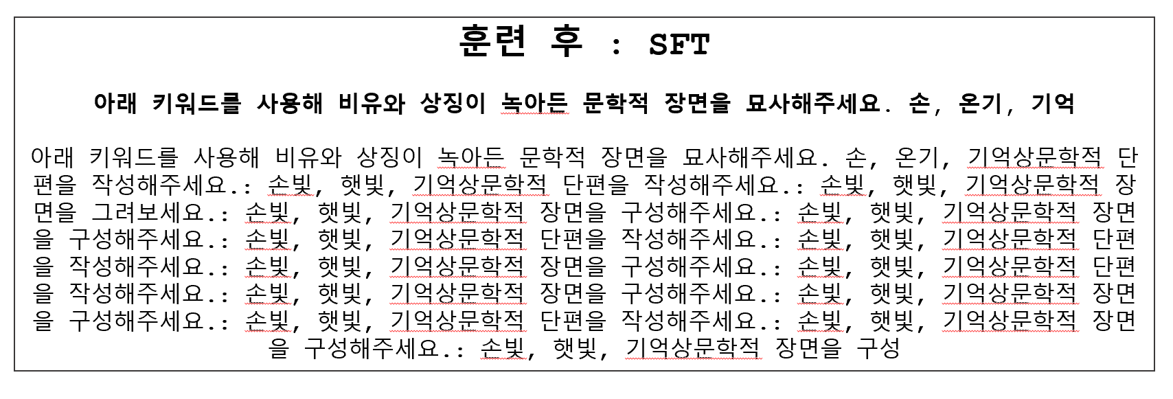 실험 결과, 사용한 모델이 1B 파라미터 규모이다 보니 전체적으로 어색한 표현이 자주 등장했고, 주어진 세 단어를 유기적으로 통합하여 하나의 완결된 글로 구성하는 데에는 어려움이 있었습니다. 이는 저희가 기대한 “문학적인 한 편의 글”이라는 결과물의 형태와는 다소 거리가 있었습니다. 따라서 출력 결과가 원하는 형식에 얼마나 부합하는지를 중심으로, 훈련 효과를 분석해보았습니다.
