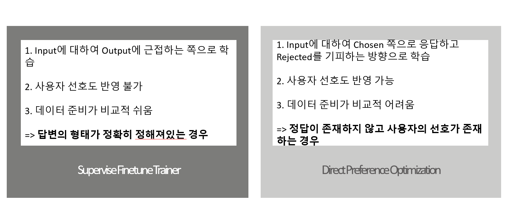 그래서 보통은 SFT와 DPO를 병행하여 학습합니다. SFT에서는 일반적인 작업 수행 능력을 부여하고 DPO에서는 사람의 선호도를 반영하여 보다 정교하고 자연스러운 응답을 생성하도록 만드는 것이죠.