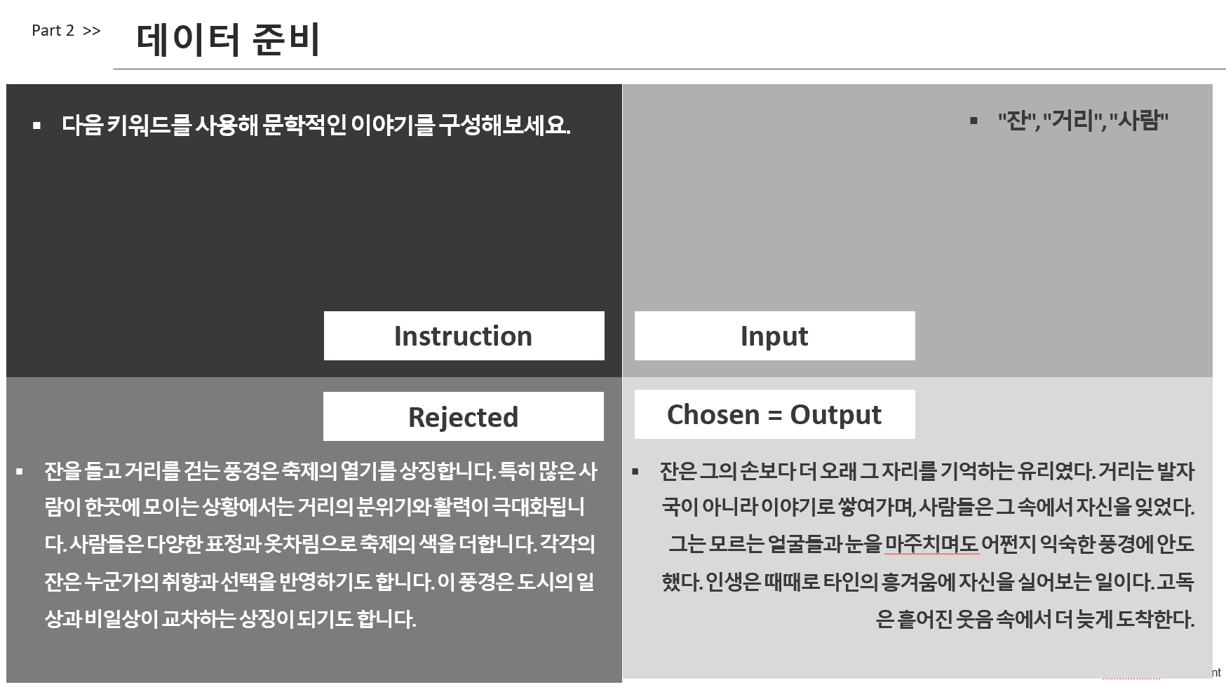 이번 실험은 SFT와 DPO가 정답이 하나로 고정되지 않은 생성 태스크에 어떻게 반응하는지를 비교하는 데 목적이 있습니다. 실험에 사용된 태스크는 특정 키워드를 입력으로 받아 해당 키워드를 반드시 포함한 문학적인 글 한 편을 생성하는 작업으로, 다양한 표현 방식이 가능한 것이 특징입니다. 이는 SFT처럼 단일 정답을 학습하는 방식보다, 선호 기반으로 학습하는 DPO가 더 적합할 수 있는 대표적인 상황입니다. 이러한 특성을 바탕으로, 동일한 데이터셋 구조와 조건에서 두 방식을 비교하기 위해 실험을 설계했습니다.