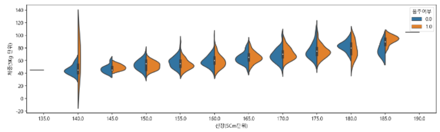 sns.violinplot(data=df_sample, x="신장(5Cm단위)", y="체중(5Kg 단위)", hue="음주여부", split=True)