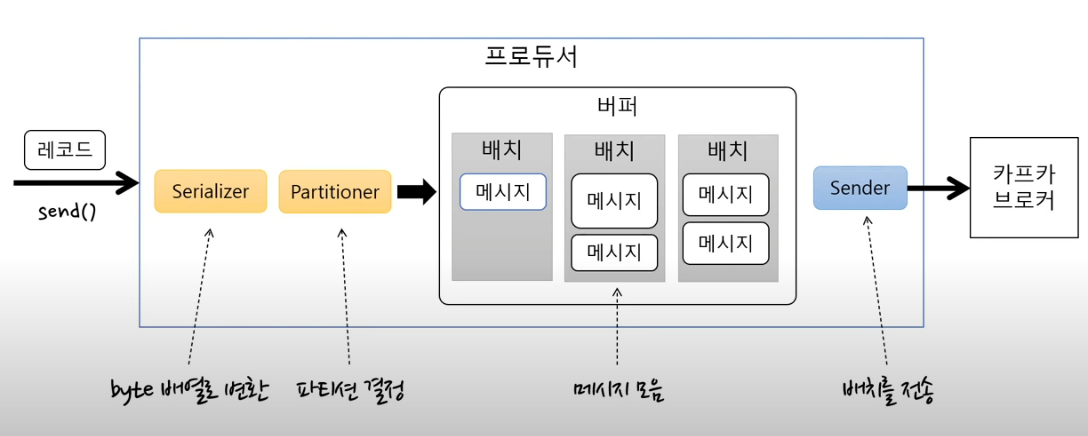- send로 보내면 직렬화를 통해 byte 배열로 변환을 한다 -> 어떤 토픽의 파티션으로 보낼지 지정