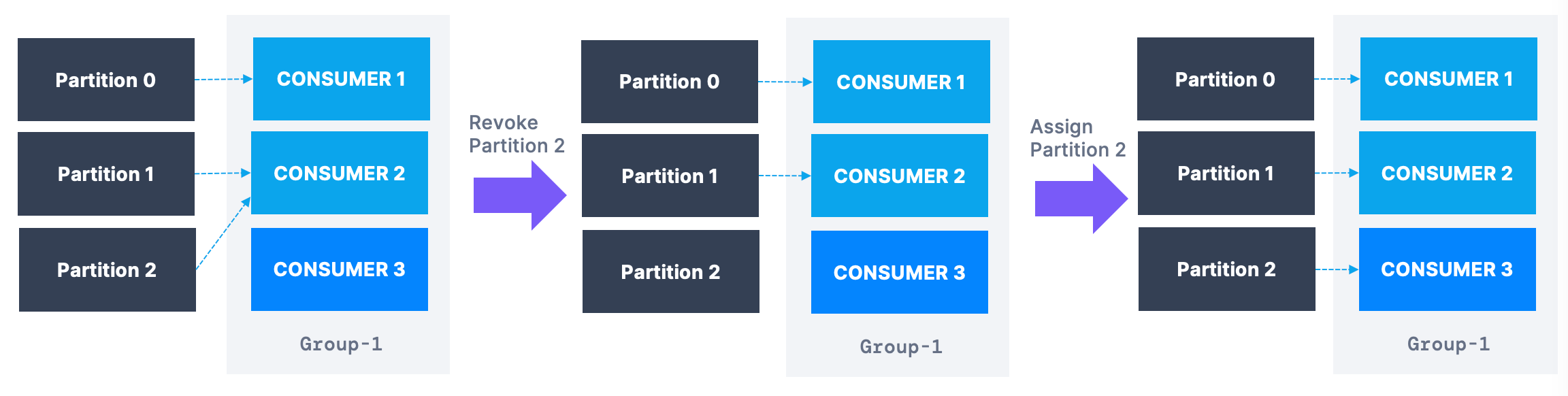 컨슈머1이 기존 파티션 1,2,3을 가지고 있다고 했을 때 컨슈머가 조인하게 되면 컨슈머1이 파티션 1,2 컨슈머2가 파티션 3을 폴링하도록 재배치하게 된다