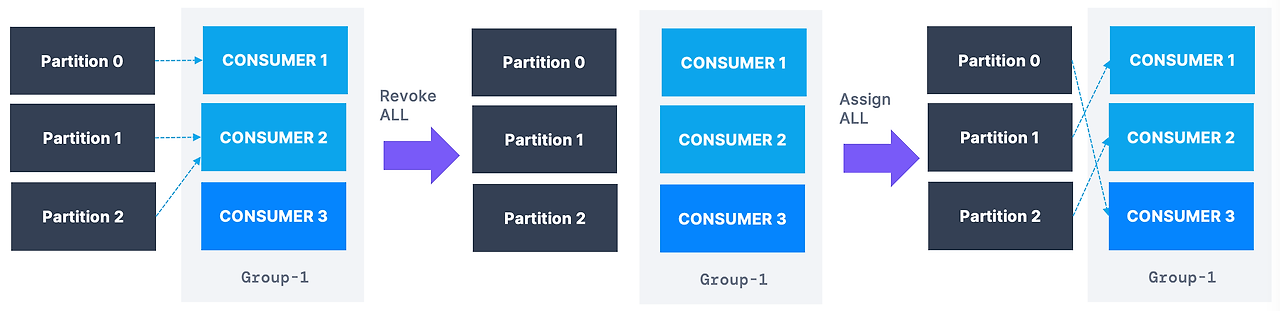 - 기본 전략으로 컨슈머가 들어오면 모든 컨슈머는 작업을 중단하고 무작위로 재할당 받는다