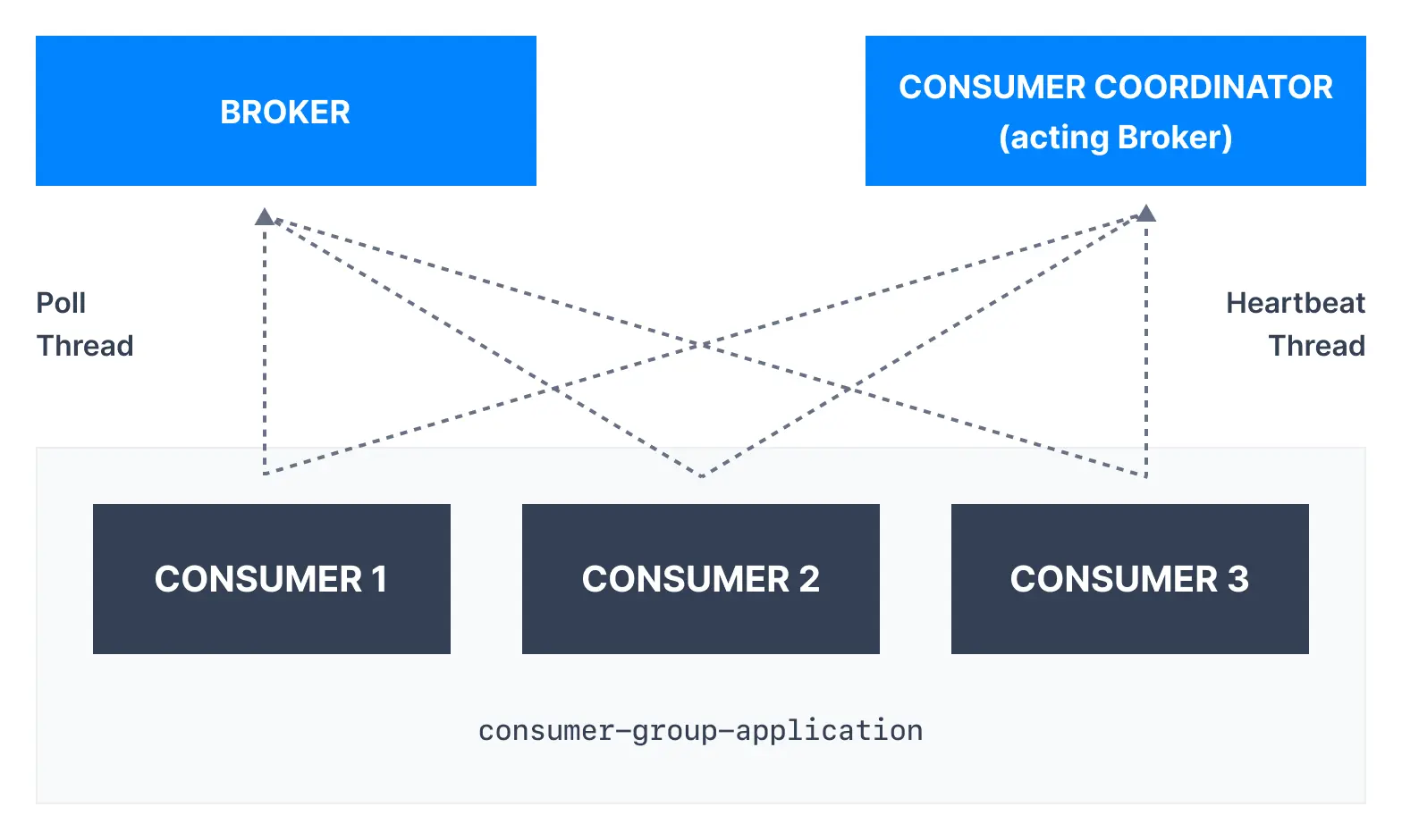 - 컨슈머 코디네이터는 컨슈머가 계속 사용중인지 감지하는데 사용하는 브로커이다
