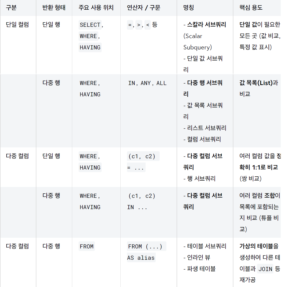 - 서브쿼리의 실행결과를 바깥쪽 메인쿼리에게 전달하여, 메인쿼리가 그 결과를 사용해서 최종 작업을 수행하게 된다