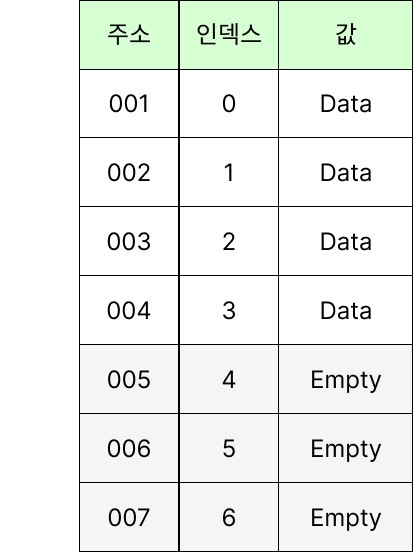 아래 그림은 크기를 7로 할당했으나, 이를 전부 사용하지 않는 경우를 표현한 것 입니다.