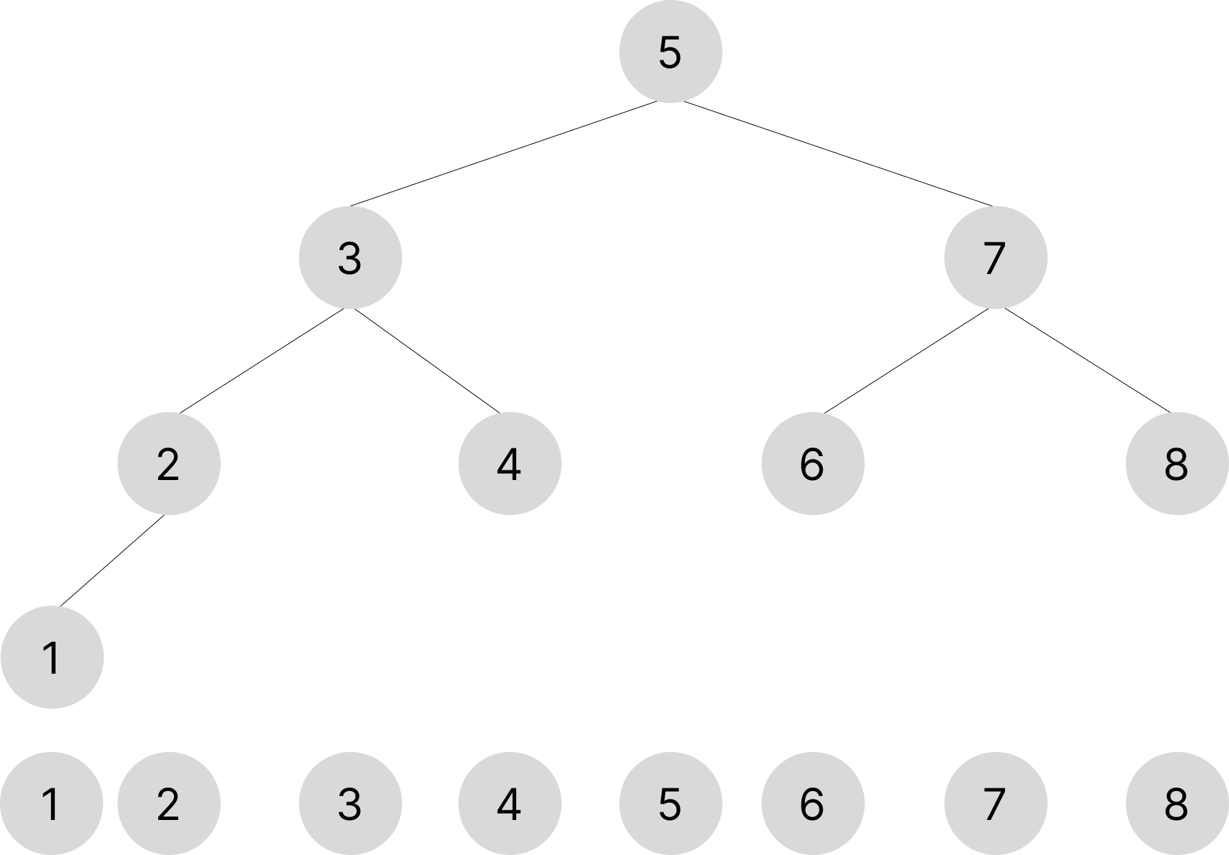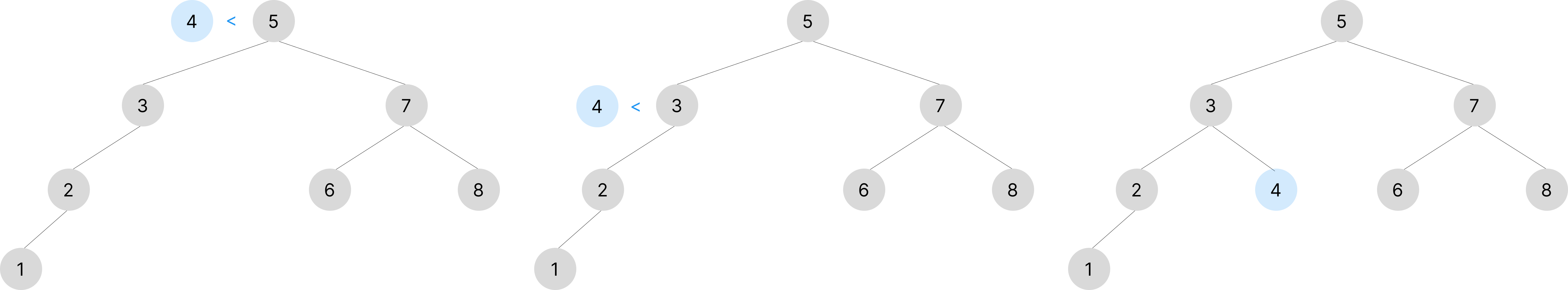 이제 4를 추가하면 위 그림과 같이 대소비교(작으면 왼쪽, 크면 오른쪽으로 이동)를 수행하여 올바른 위치에 저장됩니다. 이 과정을 통해 트리의 노드를 왼쪽부터 정렬하면 다음과 같은 결과가 나오는 것을 알 수 있습니다.