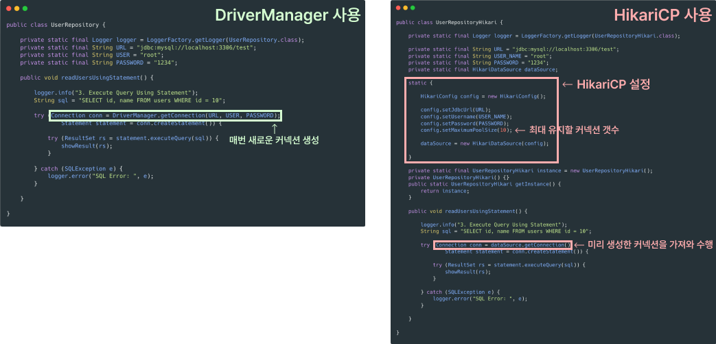 다음 예시와 HikariConfig 객체를 통해 데이터베이스 연결 정보와 유지할 커넥션에대한 최대 갯수를 지정한 후, 이를 기반으로 HikariDataSource 객체를 생성하여 사용할 수 있습니다.