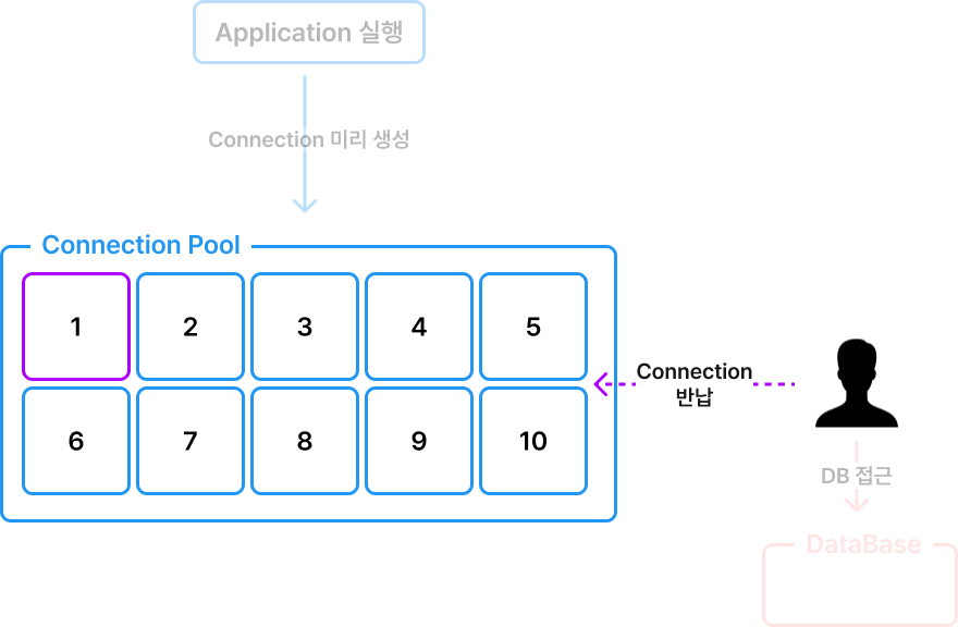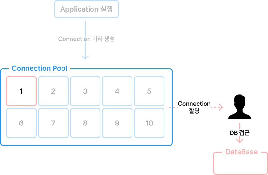 이후, 사용자가 DB에 접근할 때 기존 Connection을 할당받아 DB에 접근하여 필요한 SQL을 수행합니다.