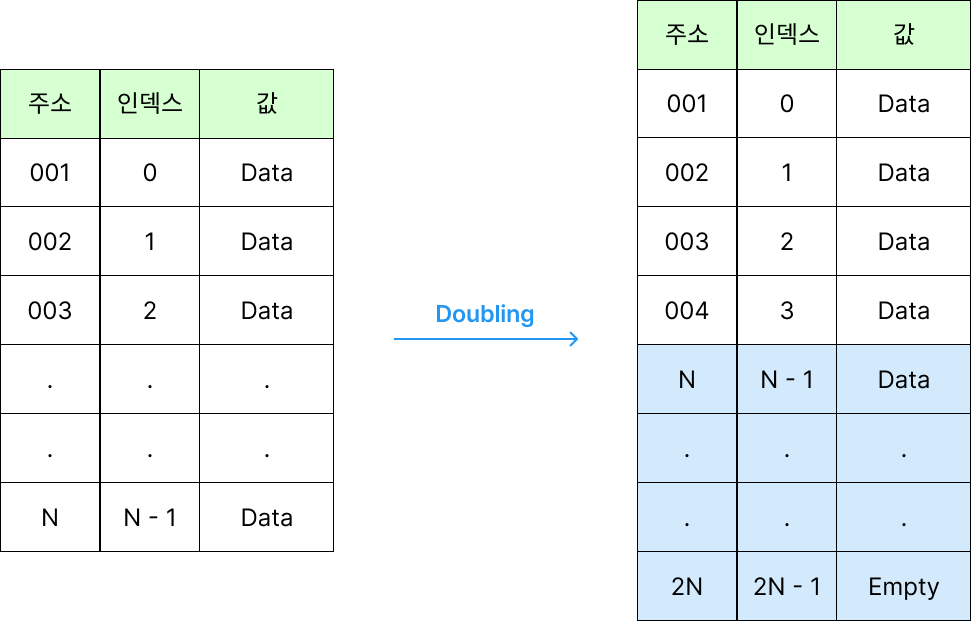 또한, 다음 그림처럼 데이터 보관을 위해 Doubling을 수행한다고 가정해보겠습니다.
