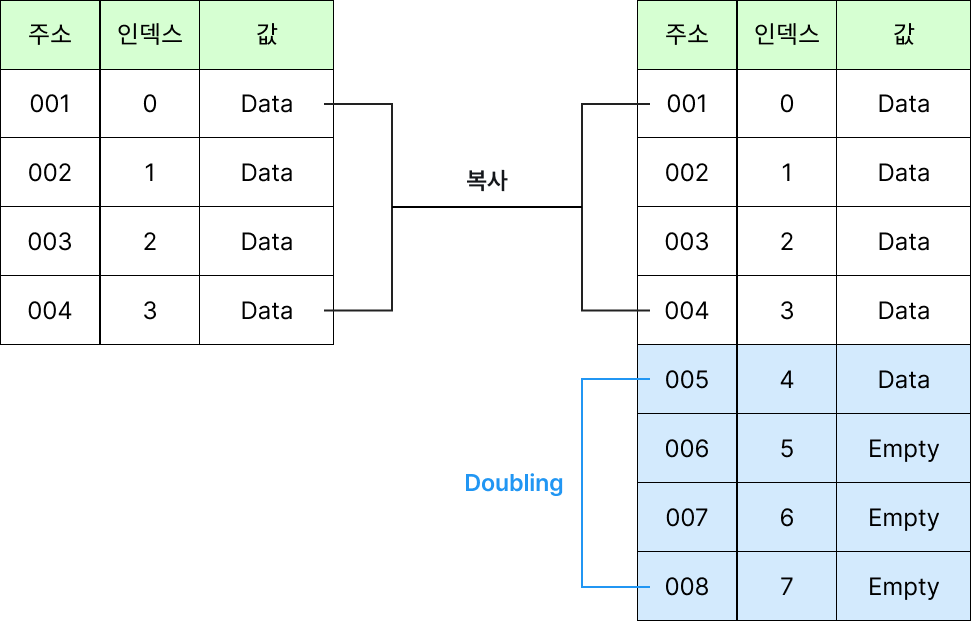 우선, 2배 크기를 가지는 Array를 생성한 후 기존 데이터를 모두 복사합니다. 이후 추가된 데이터를 저장하고, 기존 Array는 메모리에서 삭제합니다.