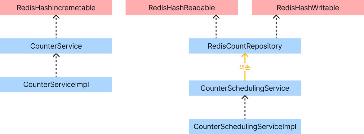 레디스 기반의 카운팅 시스템에는 두 가지 책임이 있습니다. 하나는 레디스 카운팅 수행, 하나는 수행된 카운팅을 실제 DB에 동기화 하는 것입니다. 이를 다음과 같이 클래스를 분리했습니다.