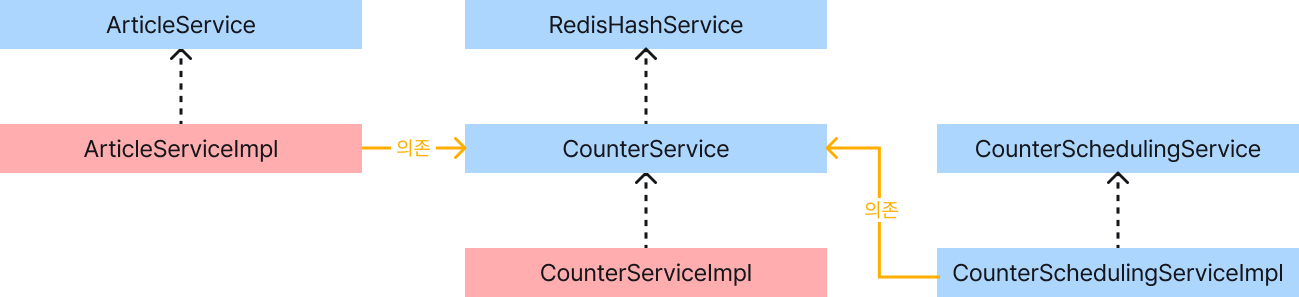 다음과 같이 RedisCounterService에 대한 의존 관계를 가지므로 RedisCounterServiceImpl을 변경하거나 다른 구현체로 교체해도 ArticleService와 CounterSchedulingServiceImpl 를 수정할 필요 없습니다.
