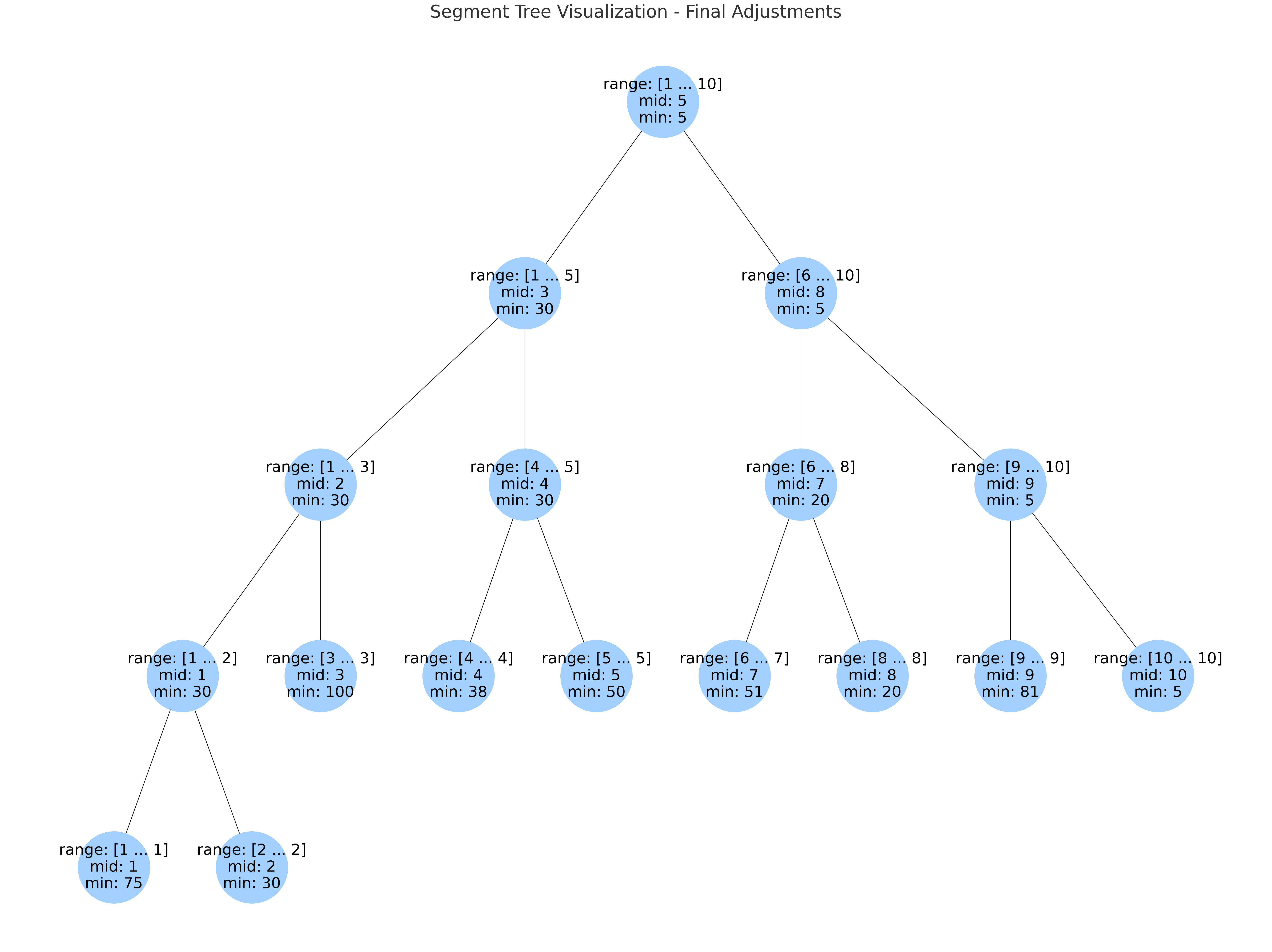 위 그림에서 1~10 사이에 있는 최솟값을 찾으면 5, 3~5 사이에 있는 최솟값을 찾으면 38임을 알 수 있습니다. 이러한 연산을 수행하는 경우 상관없지만, 계속해서 수행이 필요한 경우 이는 상당한 시간이 소요됩니다. 이를 더욱 효율적으로 수행하기 위해 Segment Tree를 사용하여 다음과 같이 나타낼 수 있습니다.
