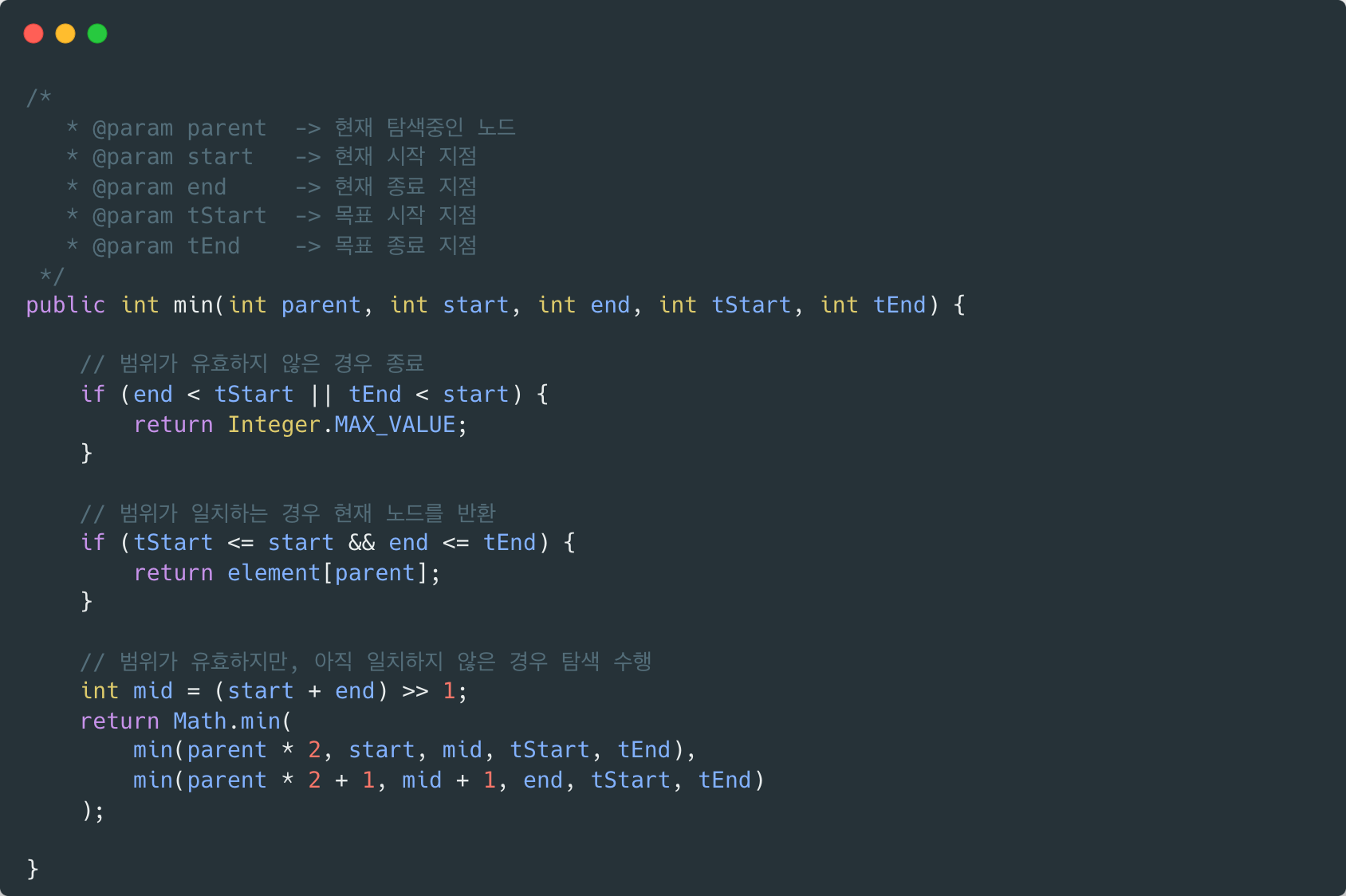 다음 코드를 사용해 각 구간에 해당하는 최솟값을 찾았습니다.