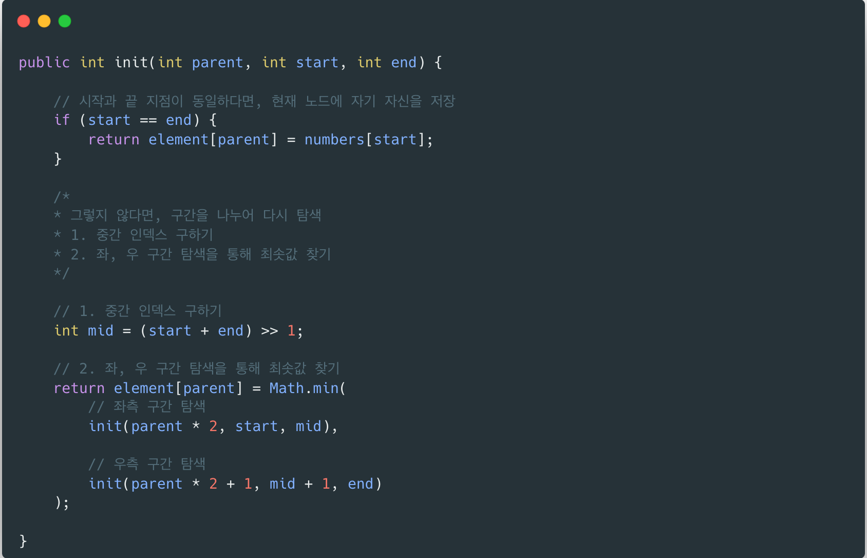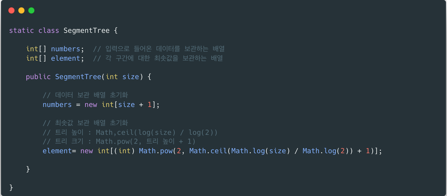 다음 코드와 같이 Segment Tree 초기화를 진행했습니다.