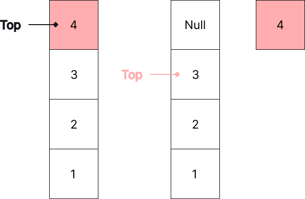 Pop 연산을 수행하면 가장 맨 위에 있는 데이터를 삭제한 후 Top 포인터를 아래로 한 칸 이동합니다.