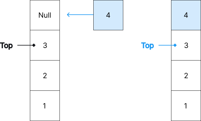 Push 연산을 수행하면 가장 위에 데이터를 쌓고, Top 포인터를 위로 한 칸 이동합니다.