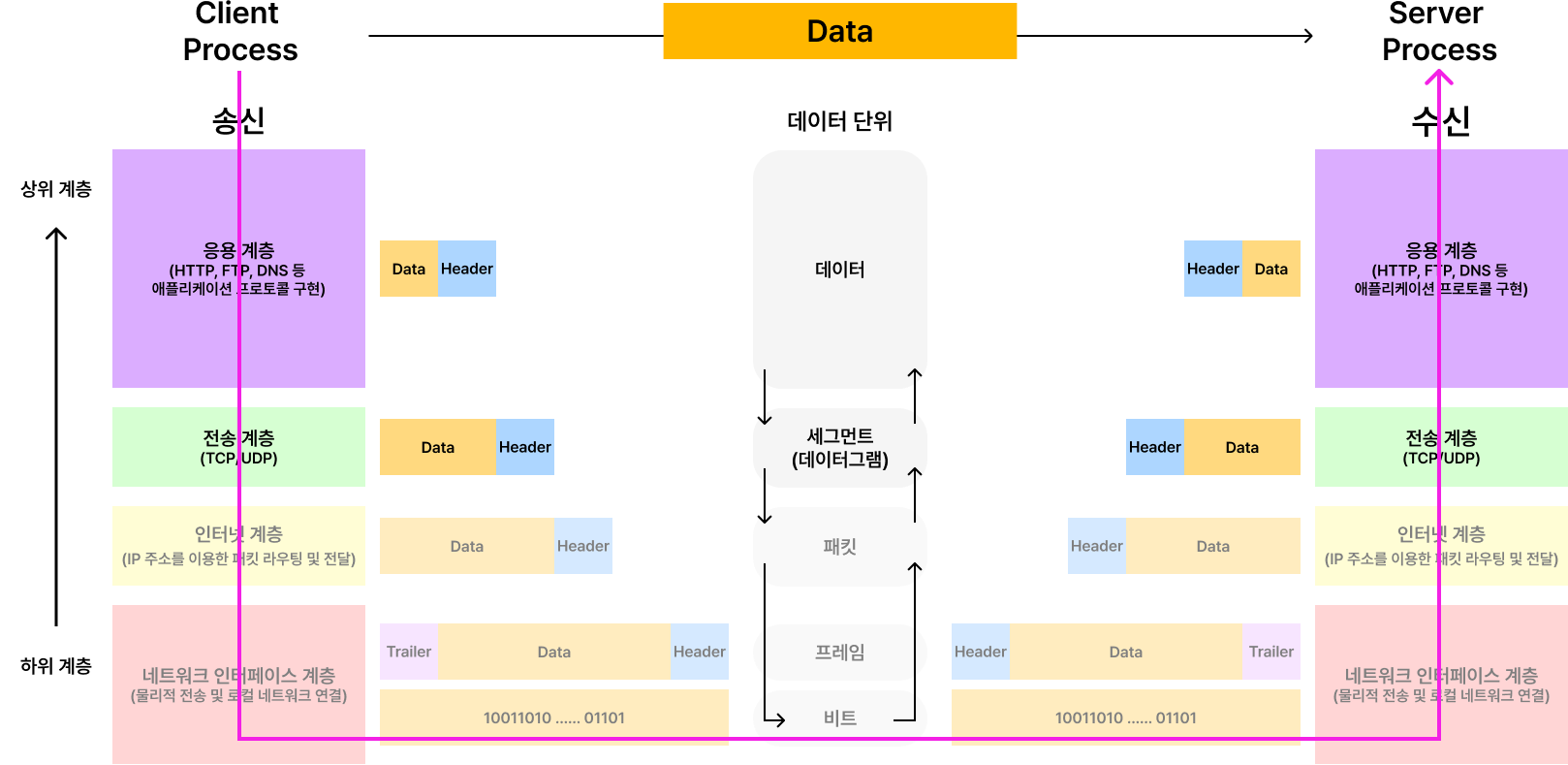 TCP/IP의 전송 계층은 두 응용 계층 사이에서 Process-To-Process 통신을 제공하는데, 이때 사용하는 프로토콜인 TCP와 UDP에 대해 알아보겠습니다. 아래 그림을 참고하면 좋을 것 같습니다.