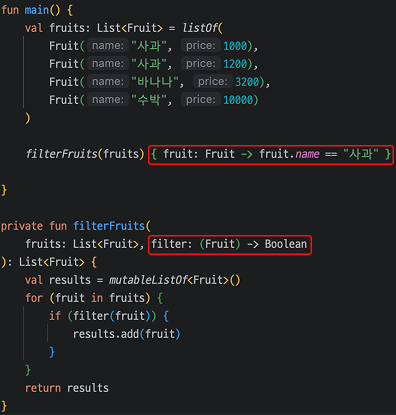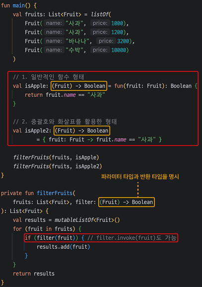 Kotlin에서는 함수를 1급시민으로 취급합니다. 즉, 함수 자체를 변수에 할당하거나 파라미터로 전달할 수 있고, 별도의 함수형 인터페이스가 필요하지 않습니다. 함수형 인터페이스를 활용해 전달받는 Java와 달리 아래와 같이 파라미터 타입과 반환 타입을 통해 전달받을 수 있습니다.