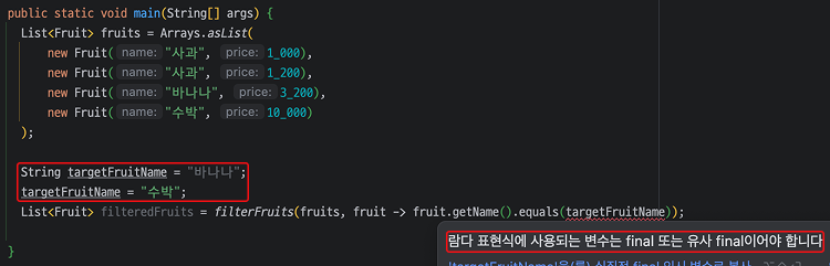 Java는 final 혹은 effectively final(사실상 값이 변하지 않는) 변수만 캡처할 수 있습니다. 아래와 같이 변경되는 외부 변수는 람다 표현식 내부에서 사용 불가합니다.