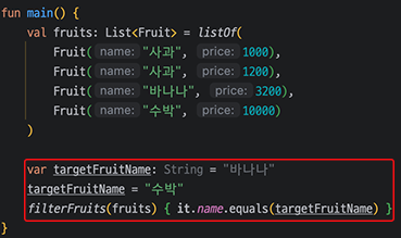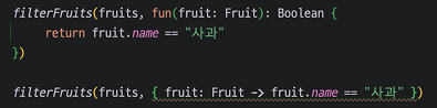파라미터에 들어가야 할 파라미터 타입 추론도 가능하기 때문에 타입 생략이 가능하고, Kotlin에서는 파라미터가 1개인 경우 It 키워드를 사용하여 다음과 같이 형태로도 변형할 수 있습니다.