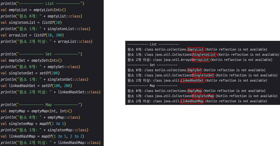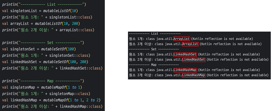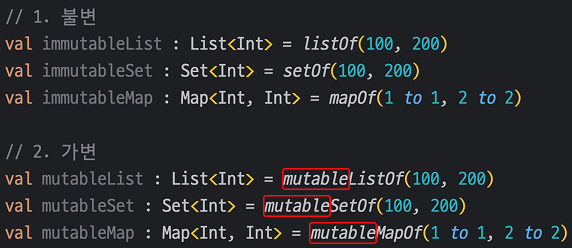 Kotlin에서는 Collection을 생성할 때 아래와 같이 불변인지, 가변인지를 명확히 결정해야 합니다.