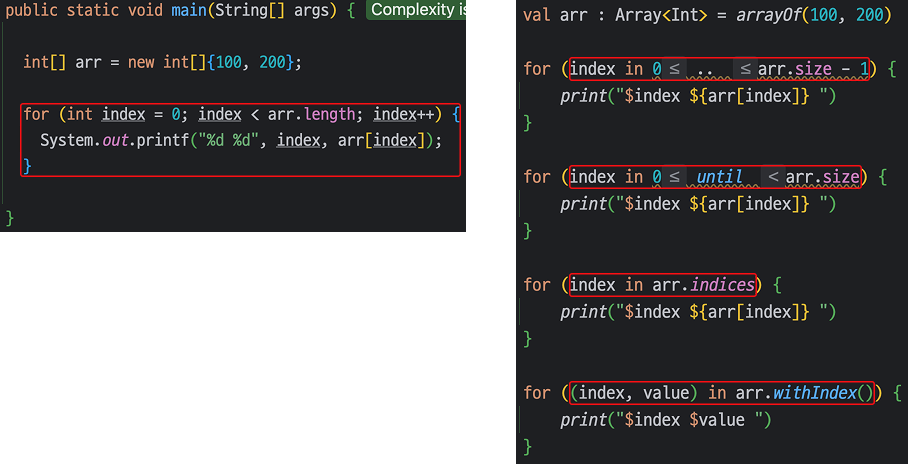Kotlin과 Java의 배열은 구조적으로는 유사하지만, 문법적으로 배열을 순회하는 방식에서 아래와 같이 큰 차이가 존재합니다