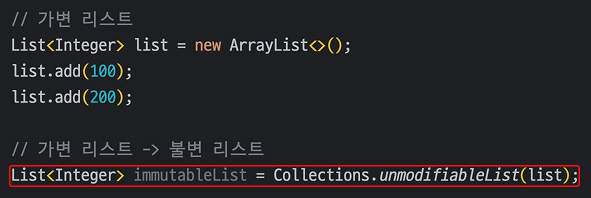 Java는 Collection에 대한 가변(읽기 전용)과 불변(변경 가능)을 구분하지 않음