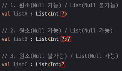 ? 위치에 따라 아래와 같이 Null 가능성을 구분할 수 있습니다.