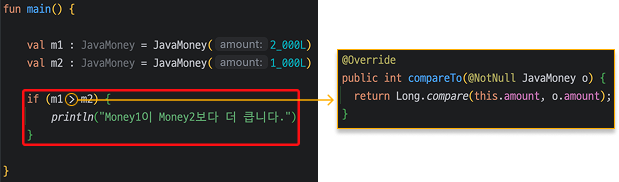 하지만, Kotlin은 아래와 같이 비교 연산자 사용시 자동으로 재정의한 compareTo() 메서드를 활용해 비교 연산을 수행합니다.