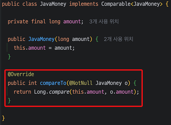 아래와 같이 클래스에 재정의한 compareTo() 메서드가 존재합니다.