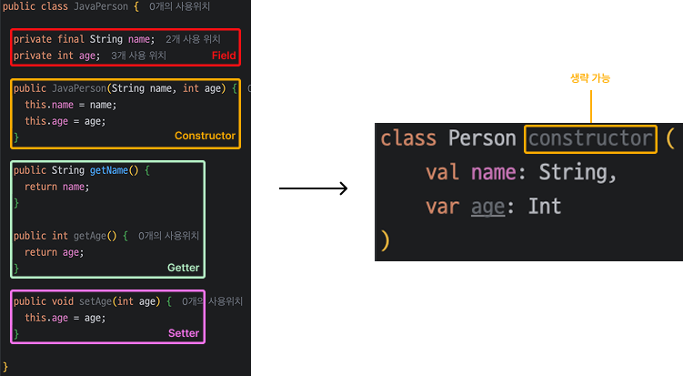 위 코드를 Kotlin으로 작성할 시 아래와 같이 Constructor, Getter, Setter 추가로 정의할 필요가 없습니다.