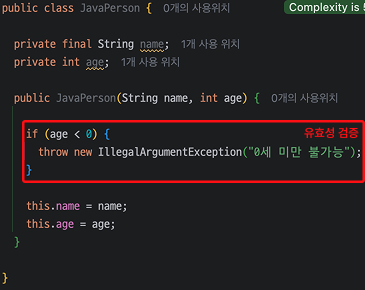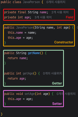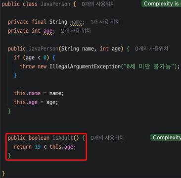 예를 들어, Java에서는 Person이라는 Class에서 age를 활용하여 성인 여부를 확인하기 위해선 아래와 같은 함수를 정의해야 합니다.
