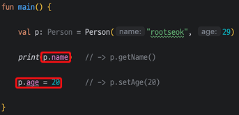 즉, Kotlin에서는 Field만 정의해주어도 Getter와 Setter를 자동으로 생성해주기 때문에, Java처럼 별도의 메소드를 생성하지 않아도 아래와 같이 작성할 경우 Getter, Setter 메소드와 동일한 동작을 수행하게 됩니다.