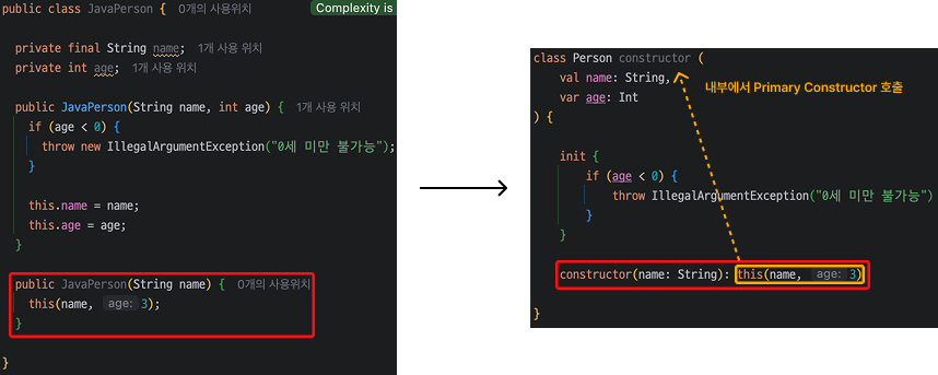Java의 경우 Constructor의 인자 일부에 고정값을 주입하기 위해 Constructor Overloading를 활용합니다. 반면, Kotlin에서는 아래와 같이 Secondary Custructor를 활용하여 동일한 기능을 수행합니다.
