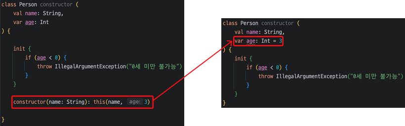 추가로, Kotlin에서는 아래와 같이 Default Value를 활용하여 동일한 동작을 수행할 수 있으며, 여러 개의 Constructor를 정의하기 보다 아래와 같은 방법을 더 권장하고 있습니다.