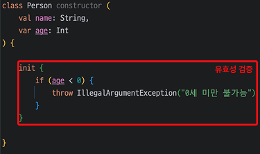 Java의 경우 일반적으로 아래와 같이 Constructor에서 유효성 검증을 수행합니다. 반면, Kotlin에서는 Constructor 호출 시 한 번만 수행되는 init 블록을 활용하여 Property에 대한 유효성 검증을 수행합니다.