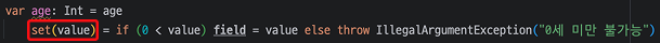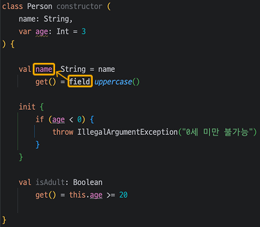 Kotlin에는 자기 자신을 가리키는 보이지 않는 Field인 Backing Field라는 개념이 존재합니다.field라는 예약어를 통해 사용할 수 있고, Custom Getter/Setter를 정의할 때 무한루프를 방지하기 위해 사용합니다.