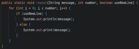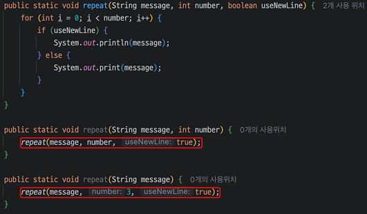 이 함수를 호출할 때 높은 비율로 반복 횟수를 3, 개행 추가 여부를 true로 사용하는 상황이라면 매번 이를 입력해주는 것은 불편할 수 있습니다. Java에서는 이를 Overloading을 통해 아래와 같이 해결할 수 있습니다.