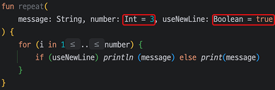 하지만, 3개의 함수를 만드는 것은 조금 비효율적이라 생각이 들 수 있습니다. Kotlin은 아래와 같이 기본값을 활용하여 Parameter가 전달되지 않을 경우 기본적으로 사용할 값을 지정할 수 있습니다. 이를 활용하여, 1개의 함수만으로 동일한 기능을 더욱 간단하게 구현할 수 있습니다.