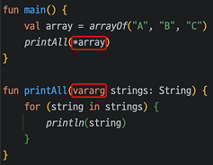 Kotlin에서 Java와 달리 가변 인자를 사용하기 위해선 vararg 키워드를 인자명 옆에 명시하고, 배열을 바로 인자로 전달할 수 없고 반드시 스프레드 연산자(*)를 명시해야 합니다. 예시는 아래와 같습니다.