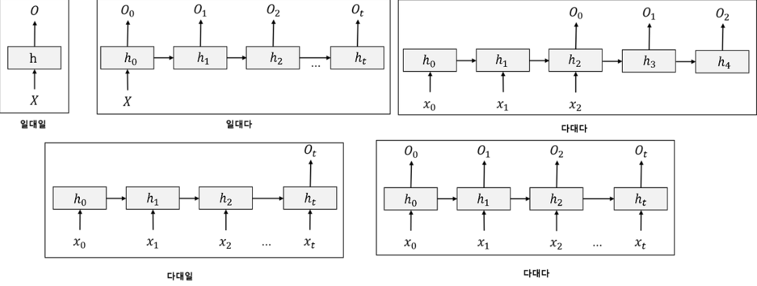 - 다대다(우상단) : 챗봇, 기계 번역